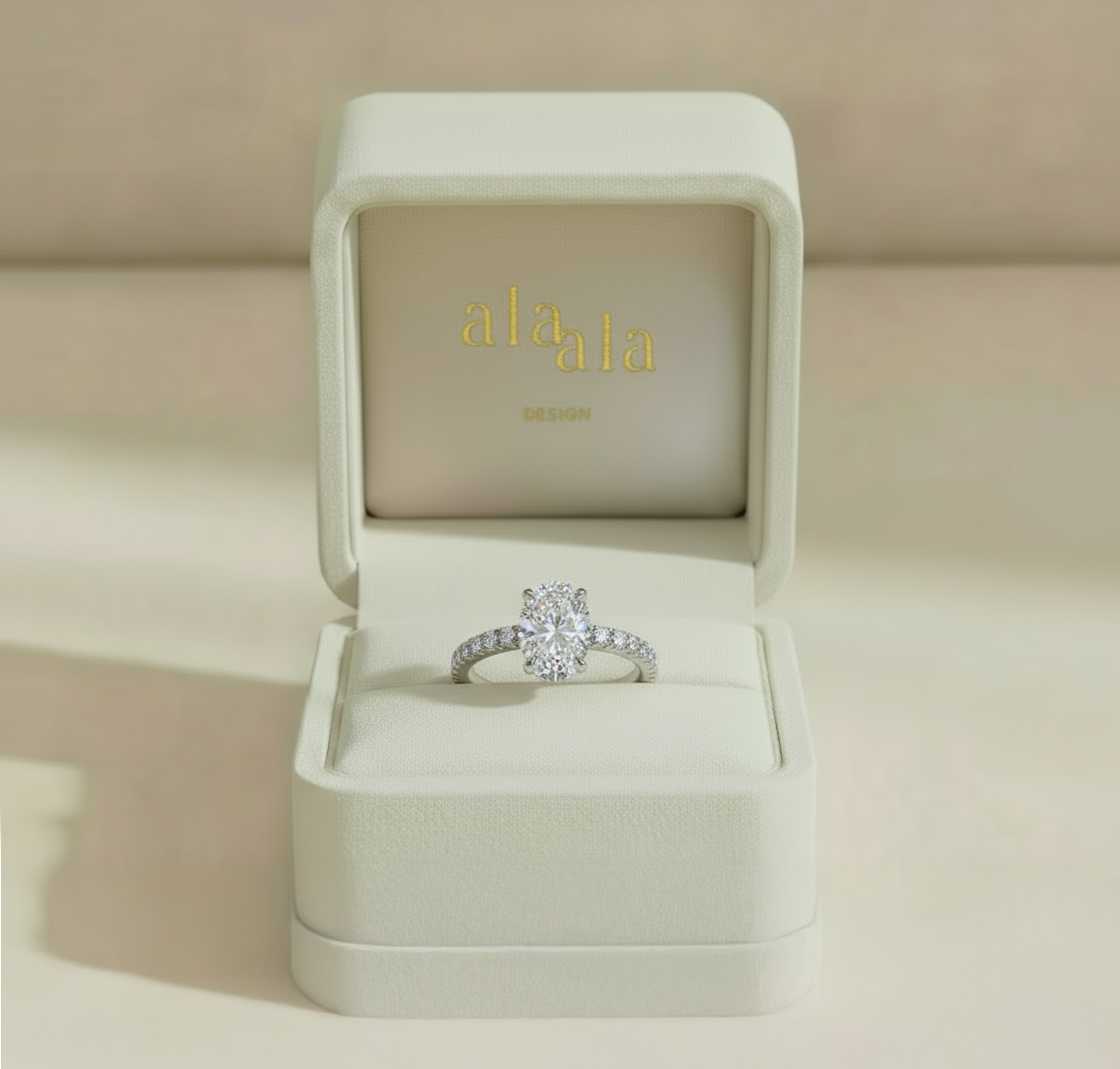 This stunning ring features a captivating 1.5-carat lab-grown oval-cut stone, known for its elegant shape and brilliant sparkle. The stone’s VVS clarity and E color ensure exceptional brilliance and a clean, flawless appearance. Set on a sleek 2mm band, the design includes a hidden halo of smaller diamonds beneath the center stone, adding extra sparkle and a touch of subtle glamour. This elegant ring balances timeless beauty with a modern twist, making it the perfect symbol of love and sophistication.