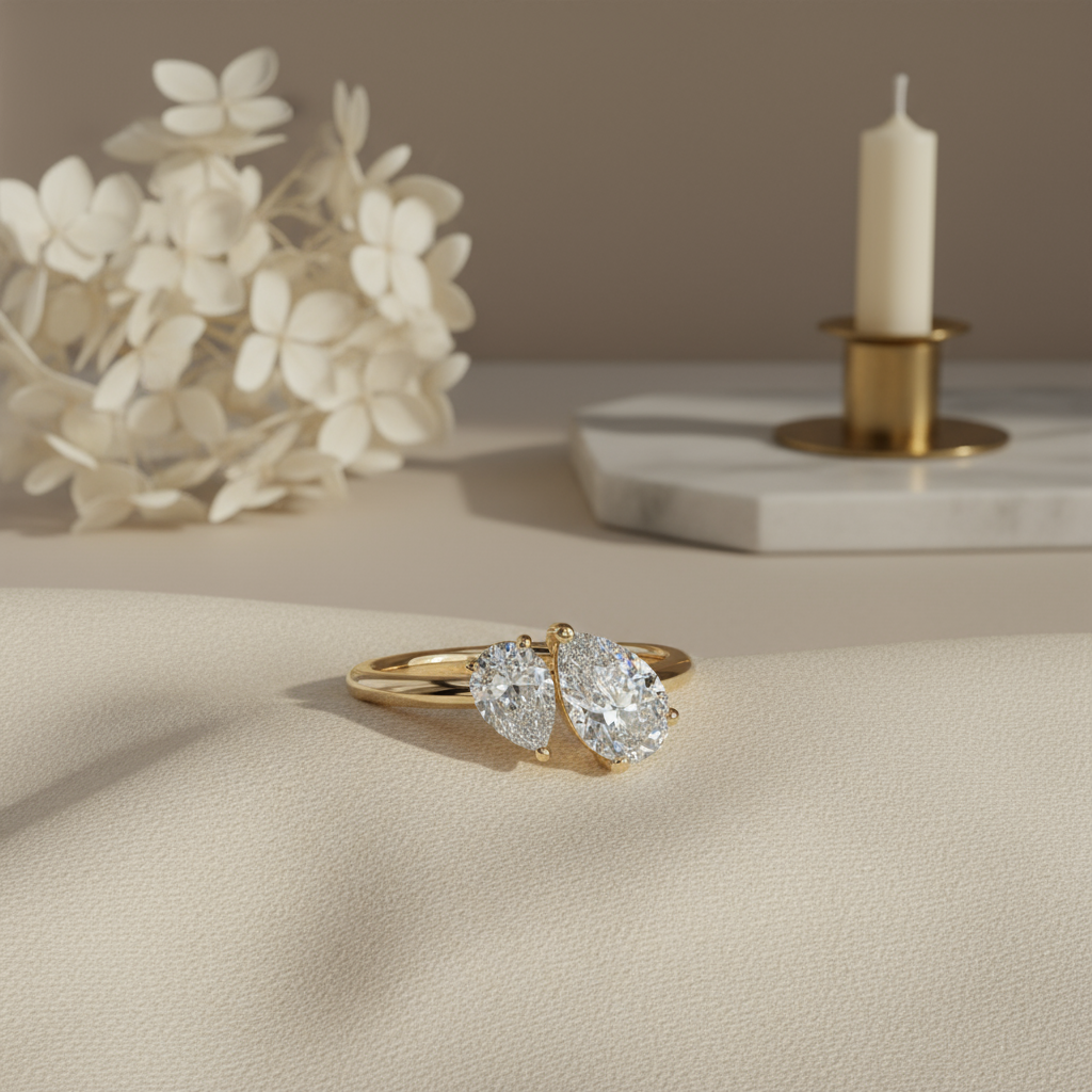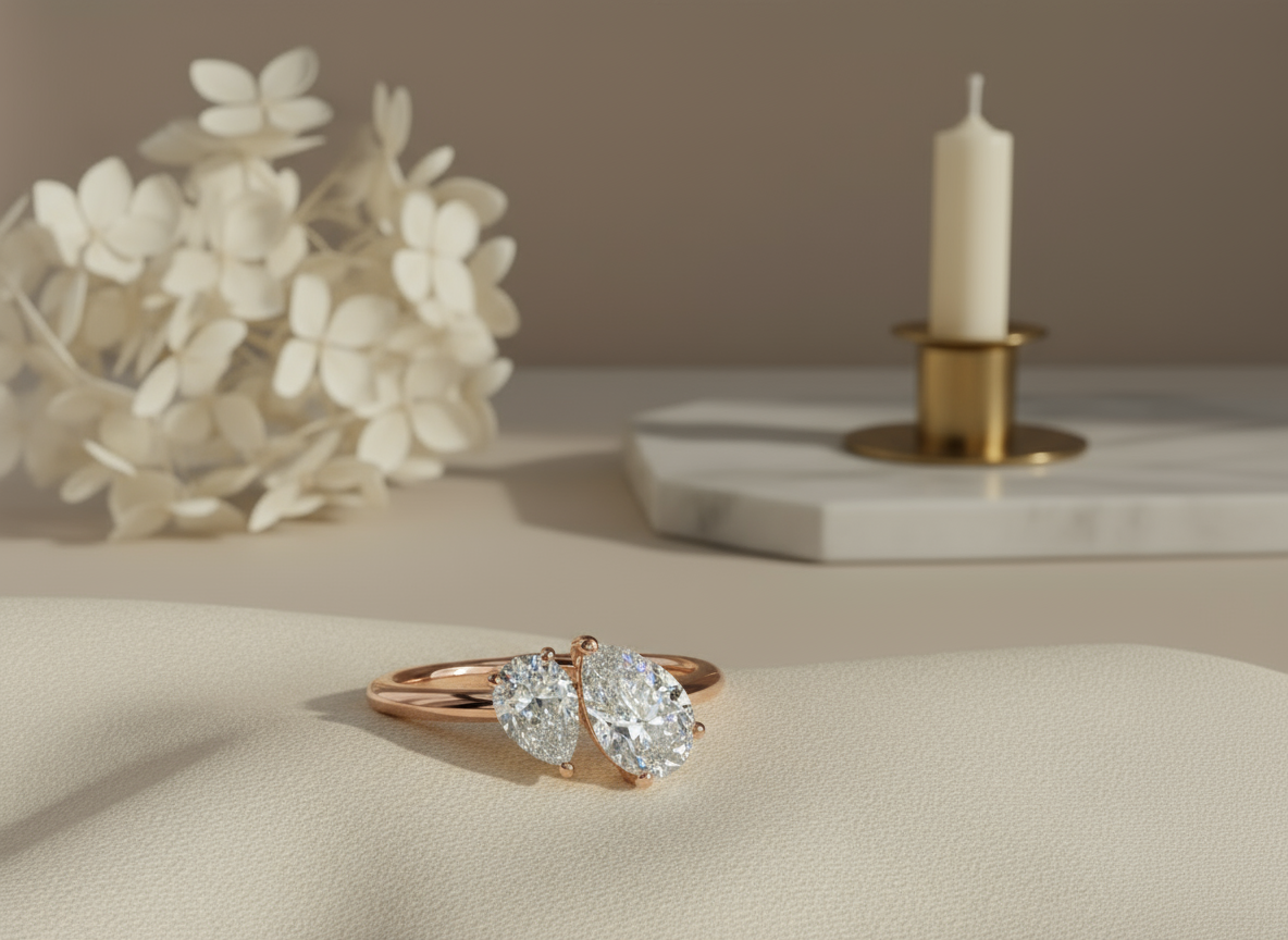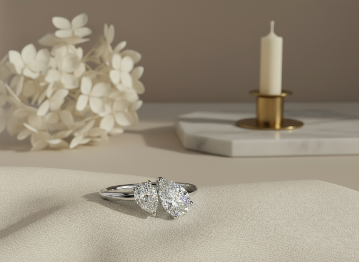 This made-to-order two-stone ring features two stunning pear-shaped lab-grown diamonds, one weighing 1.5 carat and the other 1 carats, both in E color and VVS clarity. Set in elegant round prongs, the diamonds are securely held while allowing their brilliance to shine through. The sleek 2mm band enhances the modern, sophisticated design. Crafted with precision and care, this high-quality ring offers both beauty and sustainability, making it a truly remarkable choice for a timeless, eco-conscious piece.
