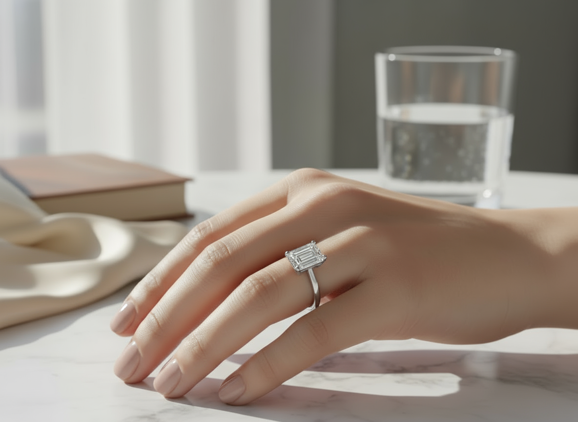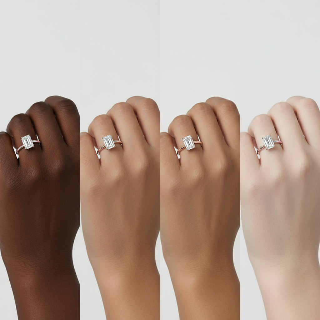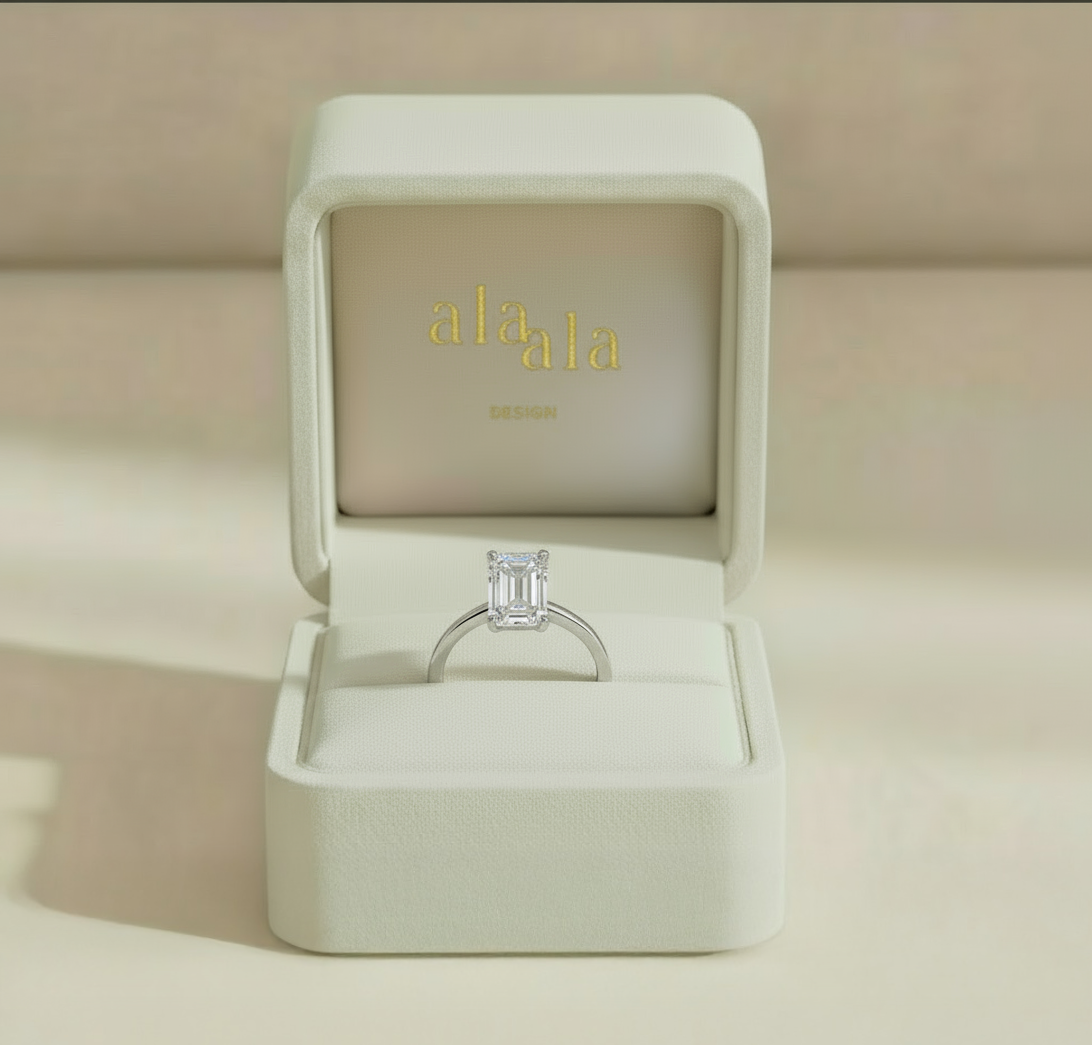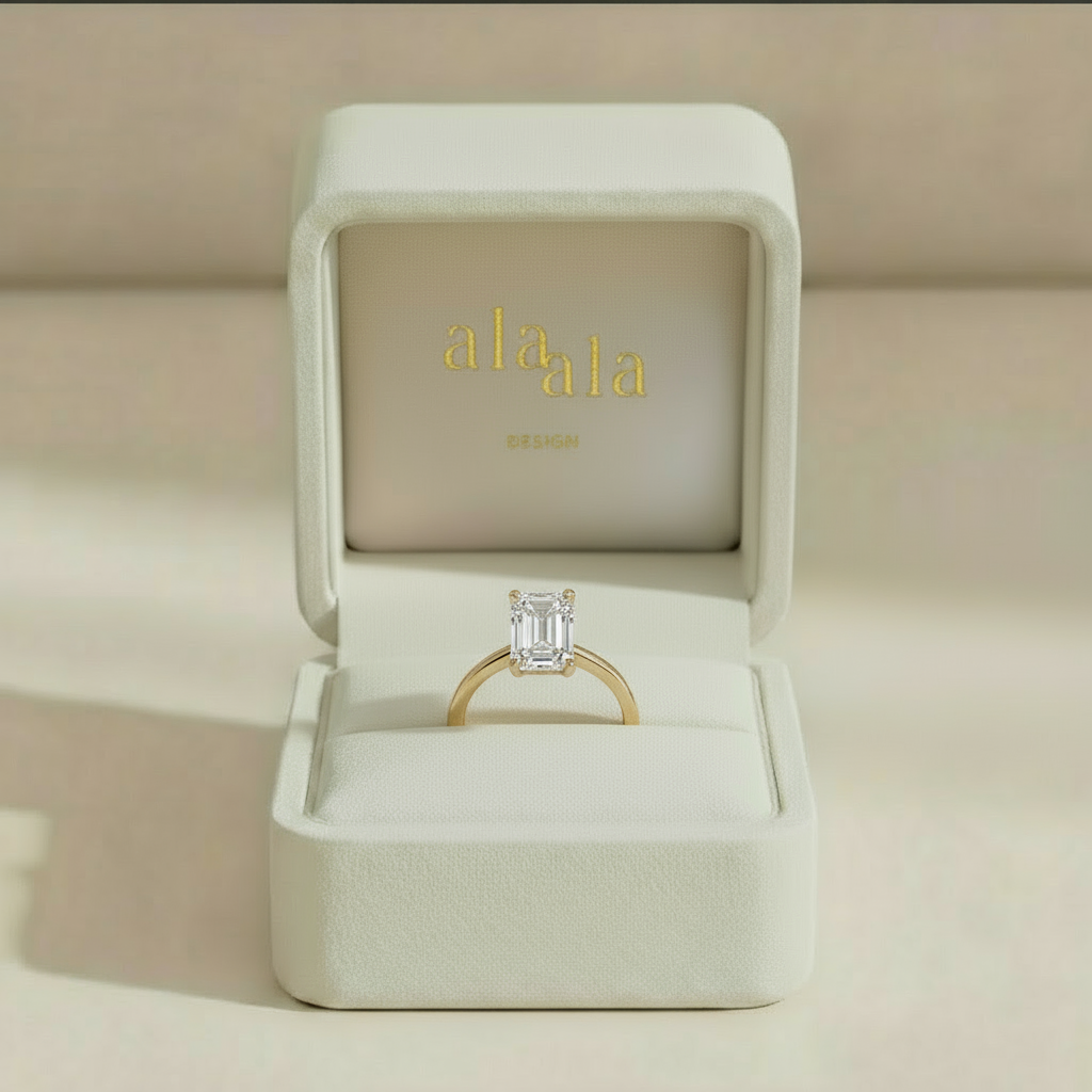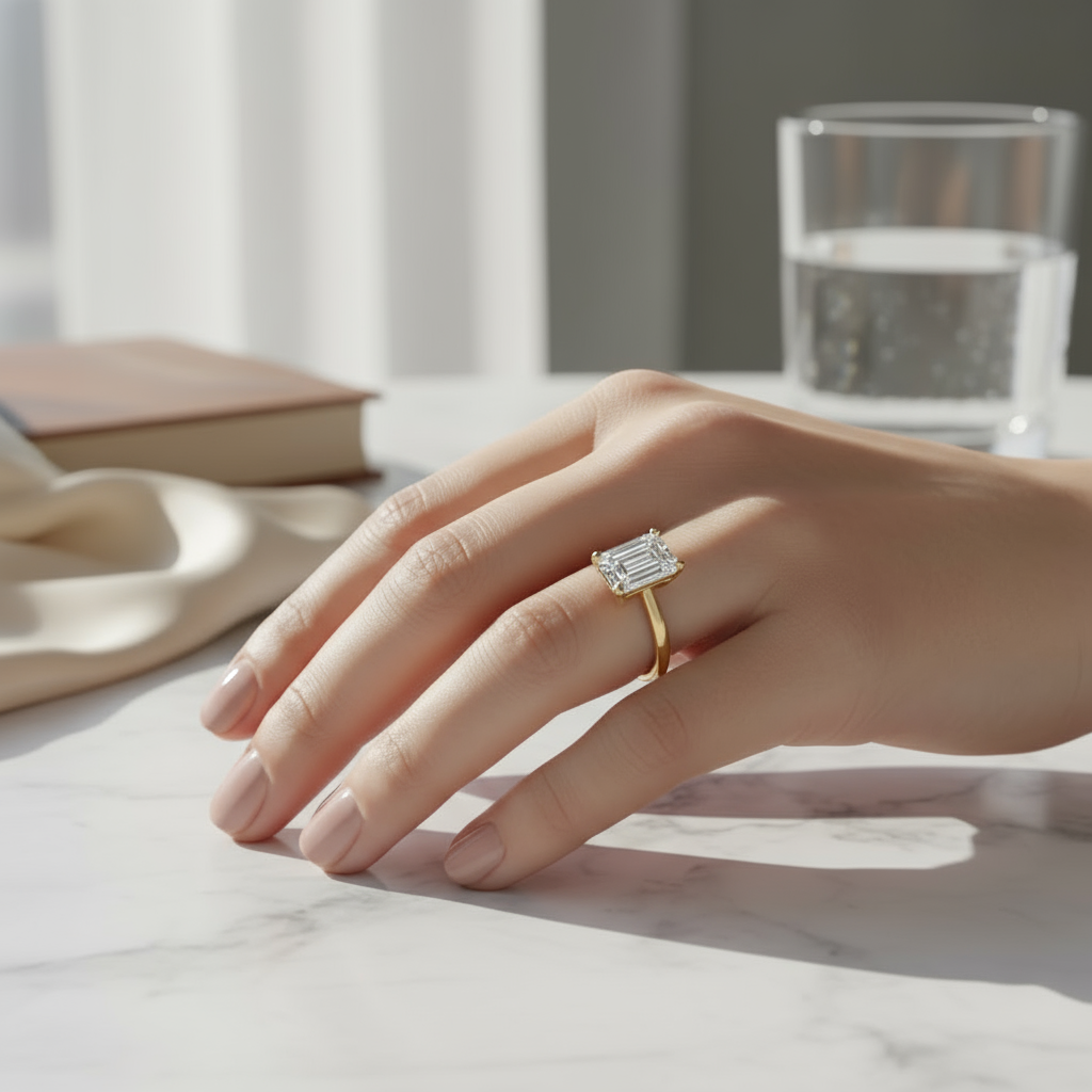 This sophisticated ring features a dazzling 1.5-carat lab-grown emerald-cut stone, renowned for its sleek, elongated facets that exude timeless elegance. The stone's VVS clarity and luminous E color highlight its exceptional brilliance and purity. Paired with a refined 2mm band, this ring embodies understated luxury and modern grace. A classic and enduring design, perfect for celebrating a love that’s as radiant and unique as the stone itself.