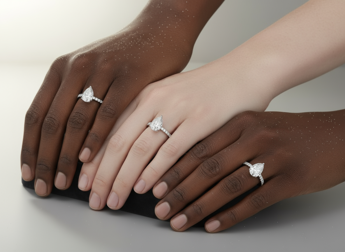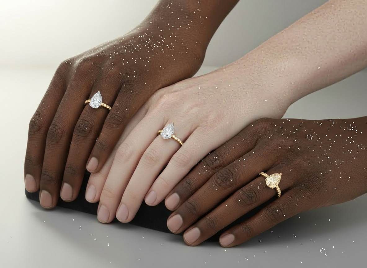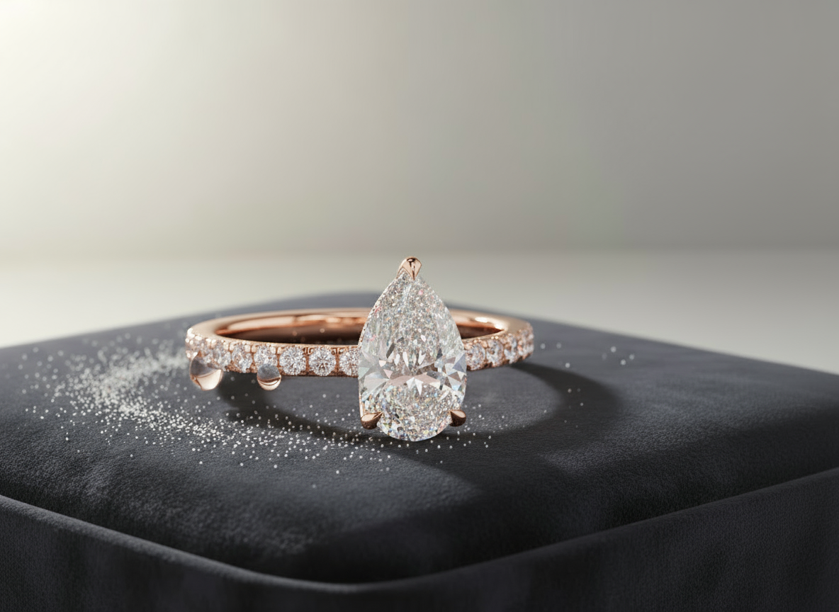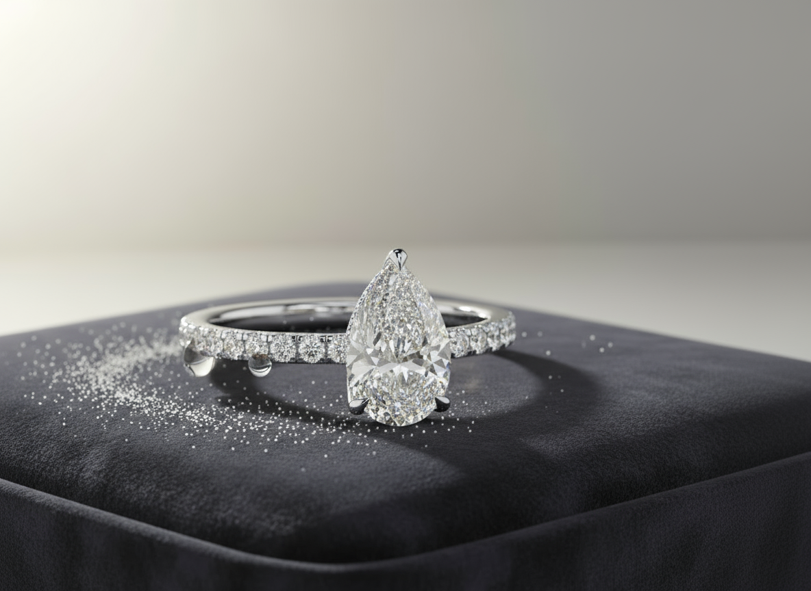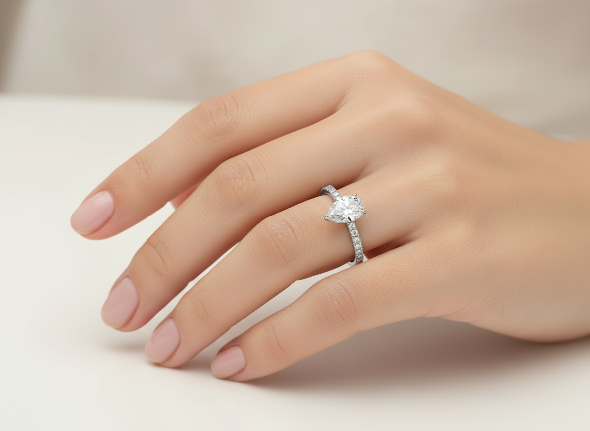 This exquisite ring features a stunning 1.5-carat lab-grown pear-cut stone, complemented by a hidden halo of smaller diamonds beneath the center stone, adding extra sparkle and brilliance. The VVS clarity and E color of the pear-shaped stone ensure a dazzling, flawless appearance. The band, adorned with pave diamonds, enhances the overall brilliance of the design. Set on a sleek 2mm band, this ring combines modern elegance with timeless sophistication, making it a perfect symbol of love and commitment.